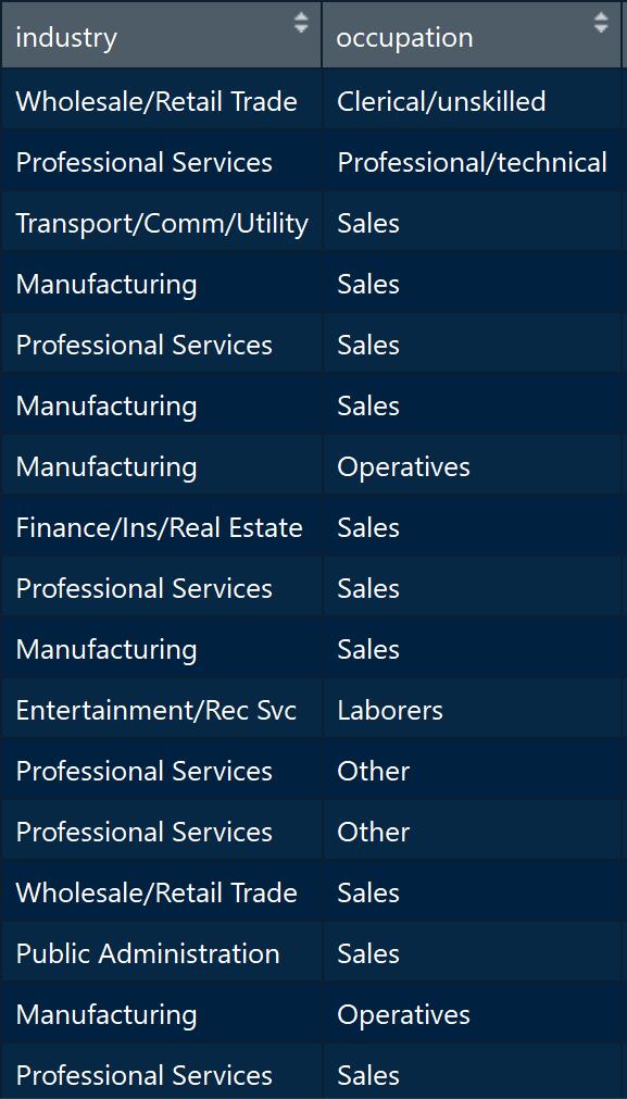 想求得每个行业(industry)对应有哪些职业(occupation),并输出结果。