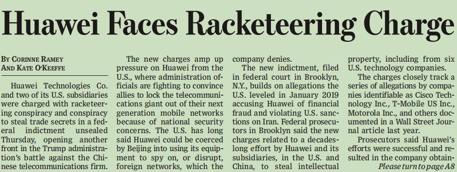 在星期三,华为技术有限公司以及它在美国的两个子公司在联邦政府未证实的控诉中被指控为密谋敲诈勒索以及盗取商业机密,这一举措打开了特朗普政府针对中国电子通信企业进行的另一斗争的序幕。