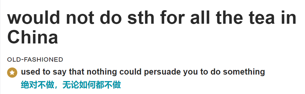 for all the tea in China来源于19世纪时期,中国生产供应了全球大部分的茶叶,所以“all the tea in China”代表“一笔巨大的财富”。