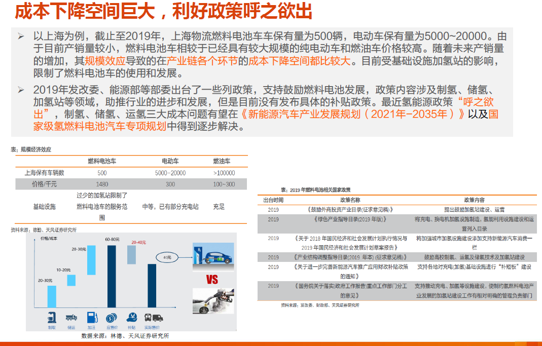 氢燃料电池车,产销量持续增长,2019年起各地政府出台燃料电池车产业鼓励政策,制氢、储氢、运氢三大成本问题有望在《新能源汽车产业发展规划(2021年-2035年)》以及国家级氢燃料电池汽车专项规划中得到逐步解决。