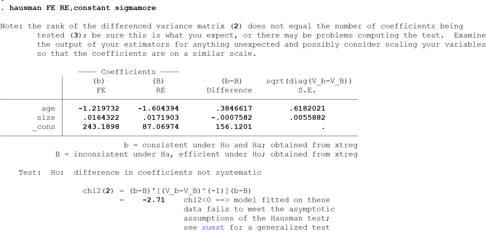linyqing 发表于 2020-2-19 15:26 豪斯曼检验时使用命令hausman FE RE,constant sigmamore出现结果为负值,看到有的说负值应该用固定效应;而 ...