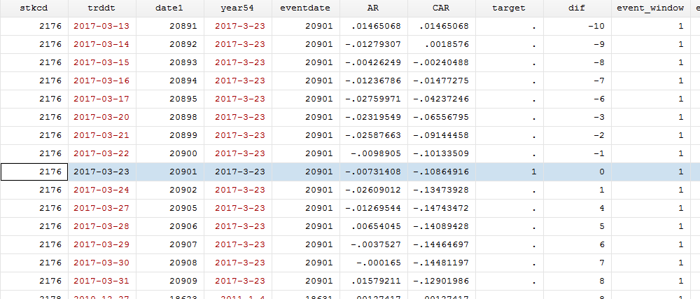 -每个事件窗口期都有一个CAR值,而我的结果只想要事件日的CAR,比如我的事件日为2017-3-23,那么我该怎么保留CAR数据,2017-3-23日期的CAR就是事件日的累计CAR?,直接保留这一条就行了???