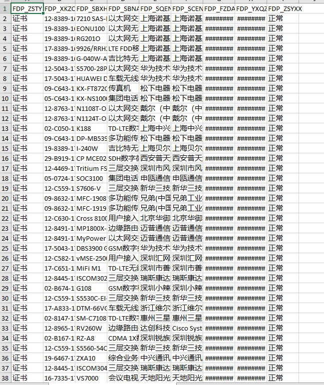 FDP_ZSTYPE证书种类 FDP_XKZCODE许可证编号 FDP_SBXH设备型号 FDP_SBNAME设备名称 FDP_SQENTNAME申请单位 FDP_SCENTNAME生产企业 FDP_FZDATE发证日期 FDP_YXQZ_DATE有效期至 FDP_ZSYXX证书有效性