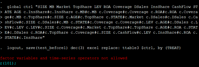 各位大神们,最近看了连老师写的有关psestimate命令的帖子,里面有这样一步。这条命令包含了c.nodeg#c.ed这一项。但是我在模仿着做时,做差异性检验返回了"factor variables and time-series operators not allowed",这是为什么呀?