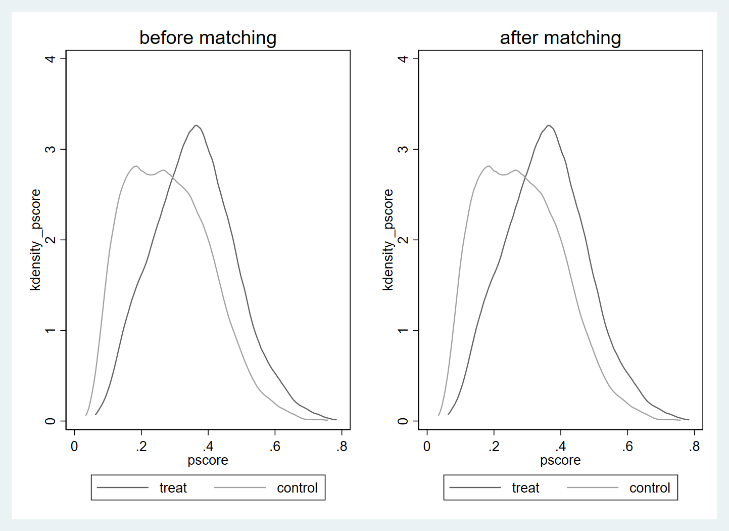 twoway (kdensity _pscore if (_treated==1),legend( label (1 "treat"))) (kdensity _pscore if (_weight!=1 &_weight!=.),legend( label (2 "control"))),xtitle("pscore") title("after matching")scheme (s1mono)