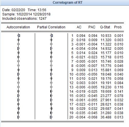 离风 发表于 2020-2-25 10:34 谢谢您,请问是如何判断收益率序列是4阶相关的呢?因为第四各数据大于0.05吗?自相关的结果应该如何分析判 ...