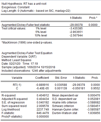 yuenchuenyuk 发表于 2020-2-23 22:41 首先,从ADF检验结果图来看,t统计量为-29.09378,远低于1%、5%、10%三个临界值水平,故拒绝原假设,序列为 ...