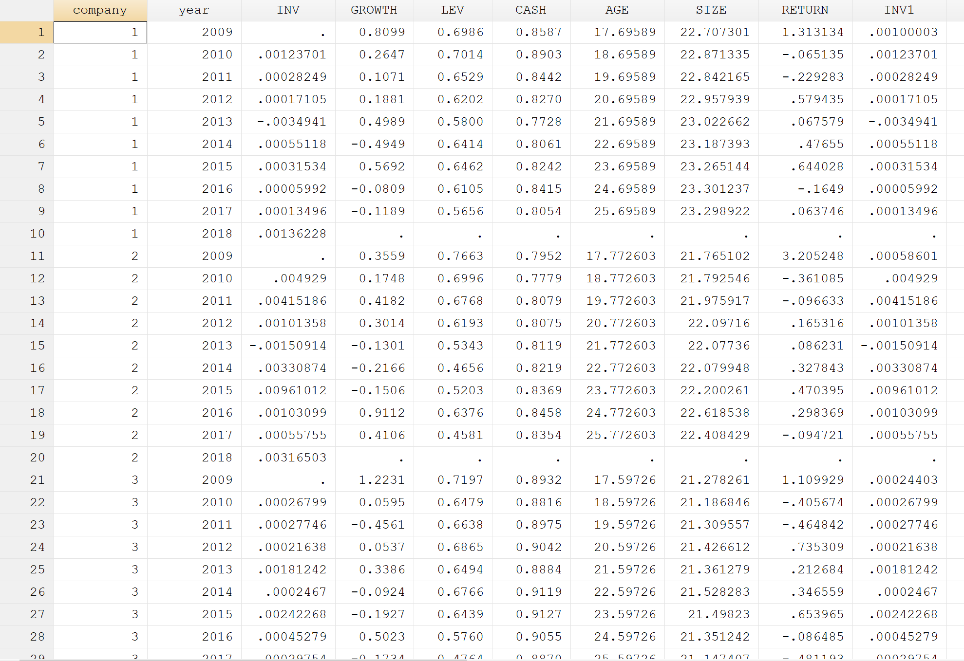 我的数据就是这样的,第一列INV是因变量,后面都是自变量,但是描述出来我的数据都是缺失值,请问各位大佬怎么回事呀!