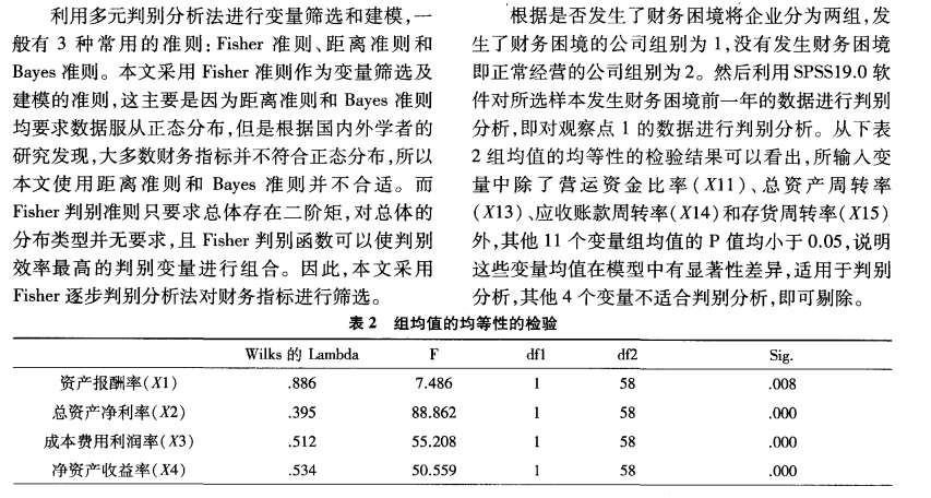 其实问题就是你面前有一堆变量,你可以根据变量的取值来判定公司是否发生财务困境。但是你首先要做的就是先把可以用来判定的变量筛选出来。建议在网上搜一下Fisher逐步判别分析法。参考网址:http://www.360doc.com/content/18/0426/23/50540690_749037222.shtml