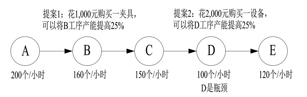提案1:花1000元购买一夹具,可以将B工序产能提高25%。