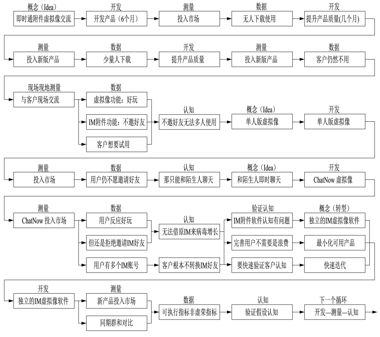 《精益创业》中介绍了莱斯如何在创业中遇到各种困难,然后如何通过将精益理论引入创业,然后获得成功。IMVU公司在战略上确定了"做IM附件的虚拟物交流"软件,它的价值假设是虚拟物交流可以给客户提供价值,而增长假设是使用此软件的用户会邀请其他IM软件的朋友,从而实现病毒式增长。我们将以IMVU公司创建软件的时间顺序来分析它是如何成功的(如图4所示)。