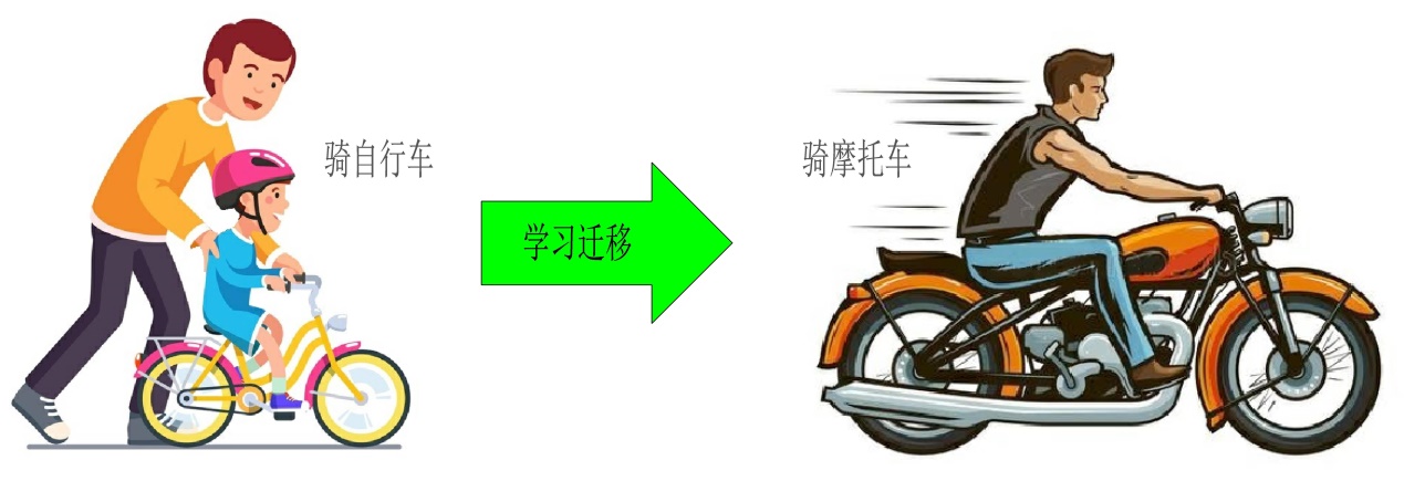 学习迁移(Transfer of learning),指一种学习中习得经验对另一种学习有影响。通常我们说的“举一反三”,“闻一知十”就是学习迁移。一个很通俗的例子就是当一个人学会骑自行车后,可以依靠自行车的技巧快速学会骑摩托车(如图12所示)。