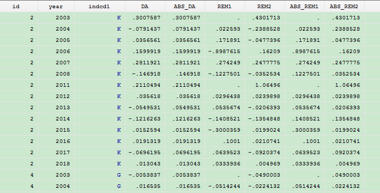 ,包括公司代码,年份,行业,盈余管理数据及其绝对值,真实盈余管理数据及其绝对值。数据预览如下:
