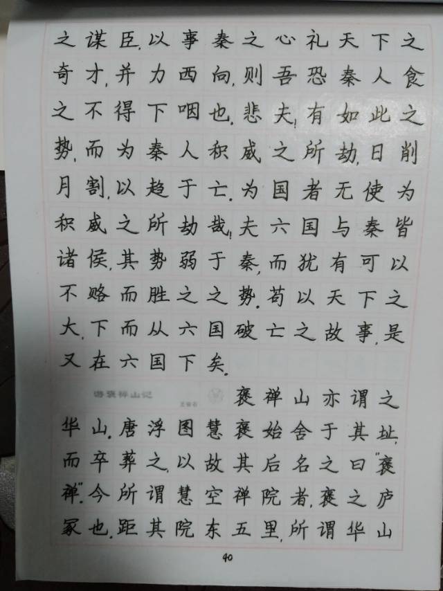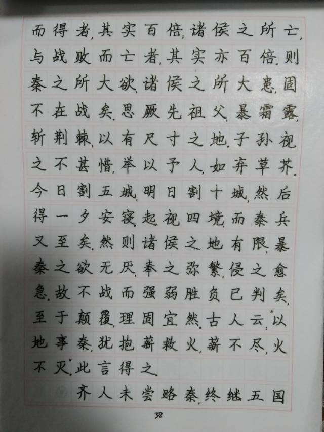 今天抄写的经典是字帖版本的《六国论》,这也是篇政论文或者议论文,论述的同样是六国和秦朝的兴亡成败,可以和前面杜牧的《阿房宫赋》,还有贾谊的《过秦论》一起比照着学习。《阿房宫赋》和《过秦论》,前一个论述的是爱其人,后一个论述的仁义,这两篇颇有共同之处;今天这篇《六国论》论述的六国灭亡是因为贿赂秦国,虽然论据很充分,论述也很有气势,但这个论据有点站不住脚了,相比较前面两篇的论据爱其人和仁义,这个贿赂秦国仅仅是六国灭亡的一方面,是次要方面,而不是主要方面。可以说,对于六国来说,正因为不爱其人和不施仁义才让六国国势日益衰微,然后不得不贿赂强大的秦国,最后一步步导致的灭亡了——