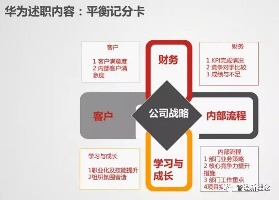 华为是一家非常善于学习的公司,它的绩效管理一开始向IBM学习,后来学习平衡记分卡,然后还用到了哈佛教授的战略分解工具,主要用在高管的述职方面,因为作为高管,必须要有战略分解的理念。
