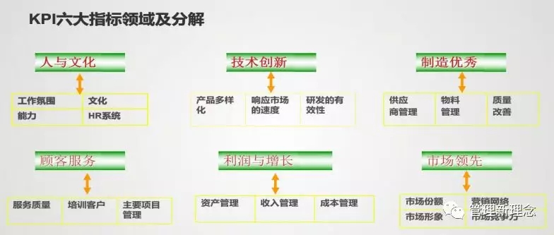 平衡记分卡很好地指导了华为KPI的思路。所以华为把KPI分成了六大指标领域。这六大细分领域其实是来自平衡记分卡。