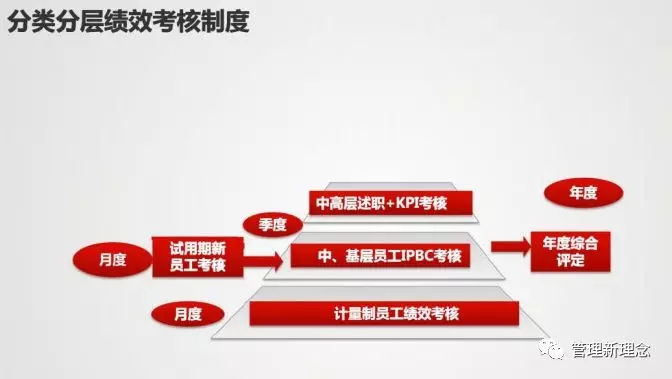 中基层采用IPBC考核。华为在一开始做绩效考核的时候,参考的是IBM的考核体系,IBM这个考核叫做PBC,就是个人业务承诺。所以这个考核也是季度的,再加年度评定。