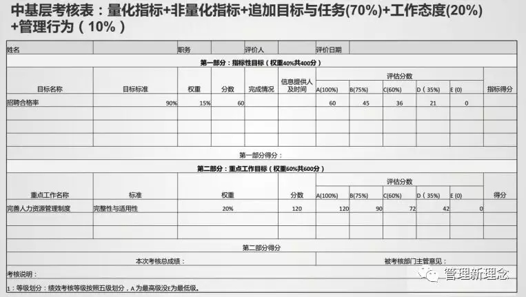 通过考核表分析,第一,它是量化指标加上非量化指标,在这张表上共占70%。剩下的工作态度和管理行为共30%。这张表的第一部分,量化的指标部分,权重是40%,一共是400分。