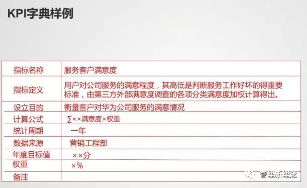 根据平衡记分卡和KPI六大细分领域,华为对KPI是有要求的,KPI必须要做成如下的一个字典,这样做是非常精准的。