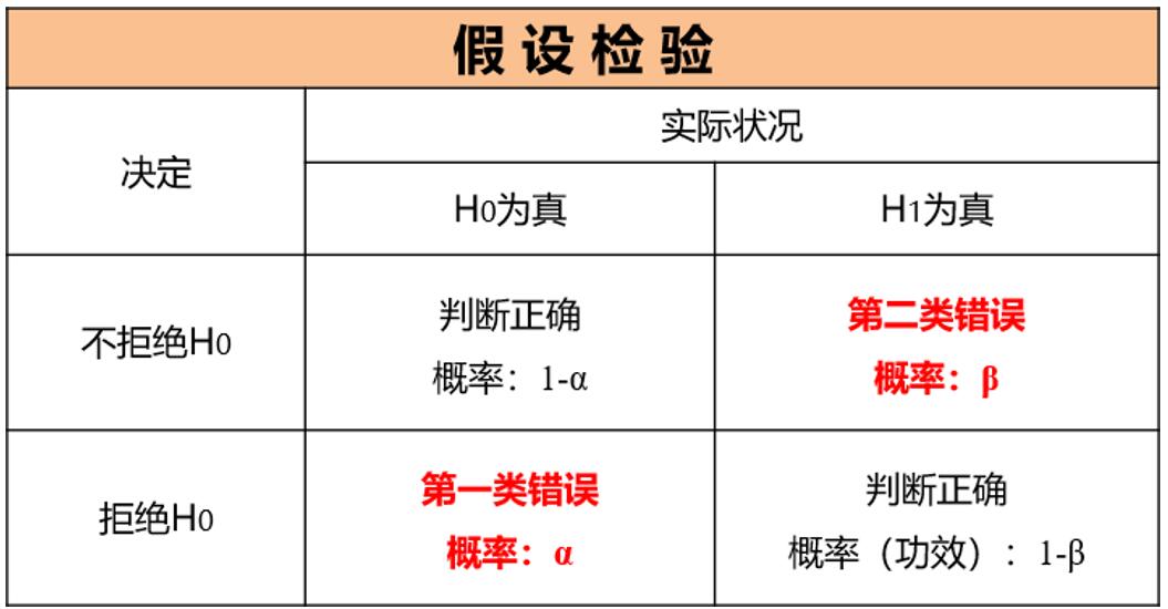 众所周知,假设检验(Hypothesis Testing),是用来判断样本与样本,样本与总体的差异是由抽样误差引起还是本质差别造成的统计推断方法。我们在做假设检验的时候,不可避免地会出现错误。如果原假设为真时被拒绝了,则发生了第I类错误;如果原假设不真时却未被拒绝,则发生了第II类错误。这两类错误的概率则被称为α风险与β风险。它们的关系就像跷跷板一样,当α风险变大时,β风险就会变小;而当α风险变小时,β风险就会变大。如果用图表来进一步表示,正如下表所示: