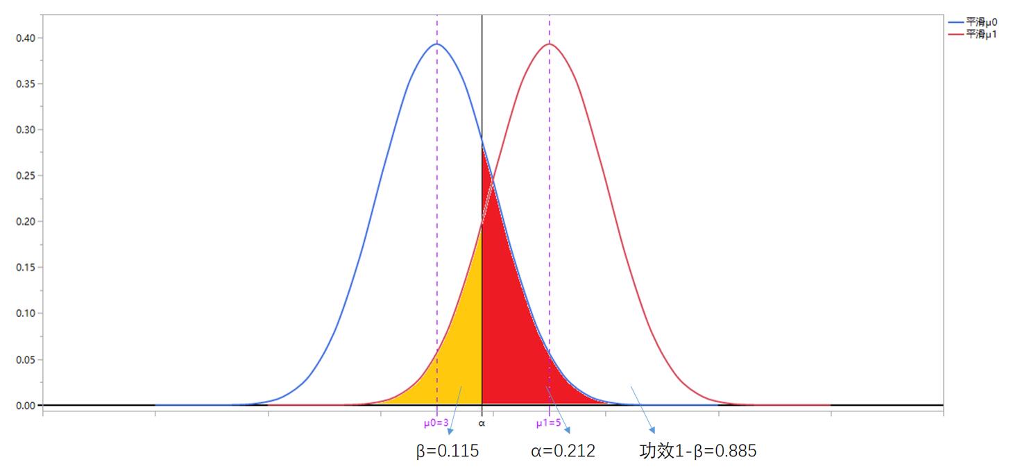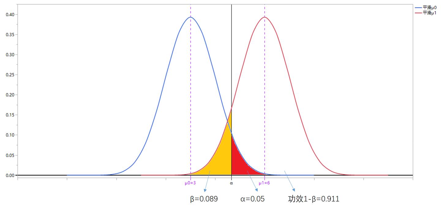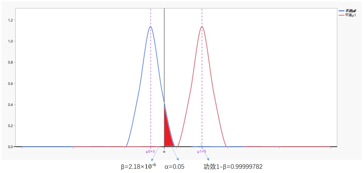 2020年2月1日,我国新冠核酸检测试剂日产量已达77.3万人份,前期无法迅速甄别病患的问题迎刃而解,自2月12日起又增加了CT临床影像学证据辅助判断。此时正常人μ0(H0)与新冠患者μ1(H1)的差异检测能力提升(μ0与μ1不再难以判断,差异显著),则在α风险=0.05不变前提下,β显著降低,如下图所示(图中体现为:μ0与μ1的差距比未采取措施时大):