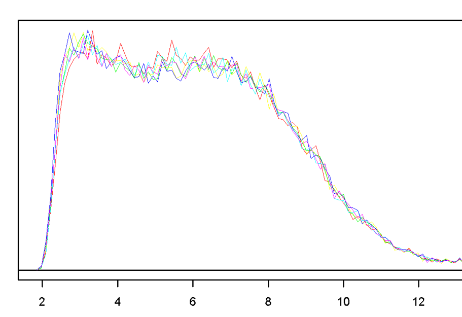 想以此实现如下折线图绘制,横轴为数字区间,纵轴为连续变量的频度,每一行为一条折线,请问如何用比较简便的方式调用ggplot2绘制?谢谢!