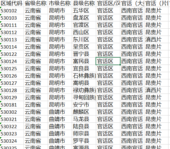 区域代码 省级名称 市级名称 县级名称 官话区/汉语方言区/少数民族方言区 汉语方言(大类) 汉语方言(小类) 汉语方言(细分)