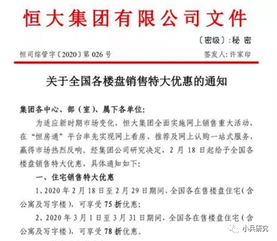 2020年2月16日,一份由许老板签发的恒大集团秘密文件一时在朋友圈疯传,引起热议。其最重要的信息是,在二月份和三月份恒大集团全国各楼盘将迎来特大优惠,分别优惠幅度高达75折和78折。