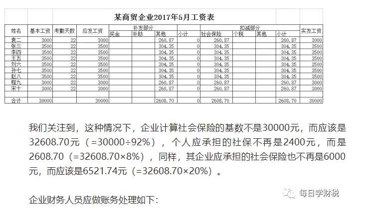 假设该公司所在地个人应缴纳的社保比例为8%,企业应缴纳的社保比例为20%,则换算计费基数后重新列工资表如下(换算办法:社保缴费基数=(实发工资+扣减的个税)÷92%):