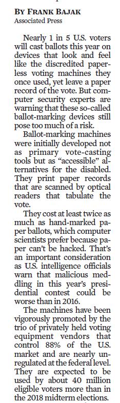 它们的成本至少是带有手写标记的选票的两倍,计算机科学家更喜欢这种选票,因为纸张不能被黑客入侵。 这是一个重要的考虑因素,因为美国情报官员警告说,恶意干预今年的总统大选的情况可能比2016年更糟糕