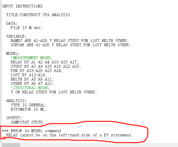 在Mplus软件中,“BY”语句用于定义潜在因子与观测变量之间的关系。当你看到错误提示“cannot be on the left-hand side of a BY statement”,通常意味着你在一个潜在因子的左边使用了一个已经定义过的变量,而不是一个新创建的潜在因子。