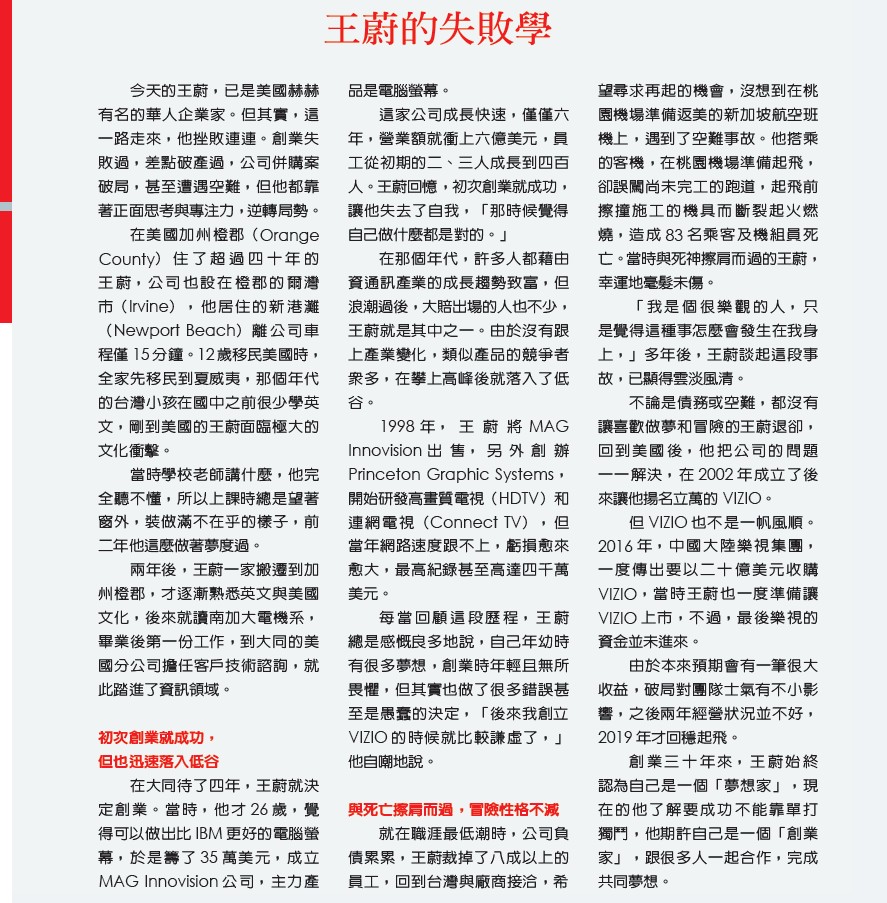 曾被《富比士》(Forbes)遴選為全美25名最傑出華人之一的王蔚,今年56歲,台灣出生,12歲時移民美國。從「一句英文都不會講」的小留學生,創造出VIZIO這個目前美國家庭不可或缺的品牌。