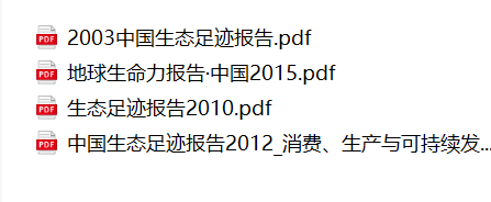 文件包含四个PDF,里面包含中国各个省份在相应年份的生态足迹(注意:有柱状图大致能看出生态足迹具体数值,但没有精确的值)