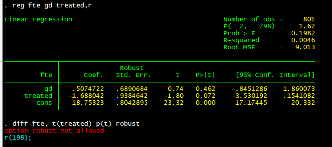学习计量经济学及Stata应用 第2版_陈强编著里的双重差分发法,跟着上面的例子进行练习的时候,发现stata老是出现错误,就是 diff fte, t(treated) p(t) robust 这一条,stata上面这一条就会出现错误,使用的是stata11和15,都出现了错误。请问这是怎么回事?
