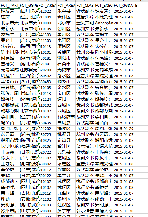 FCT_PARTY当事人 FCT_GGPERSON公告人 FCT_AREA公告人对应地区维度 FCT_AREAC公告人对应地区 FCT_CLASS公告分类 FCT_EXECUTIONDOC执行文书内容 FCT_GGDATE公告时间