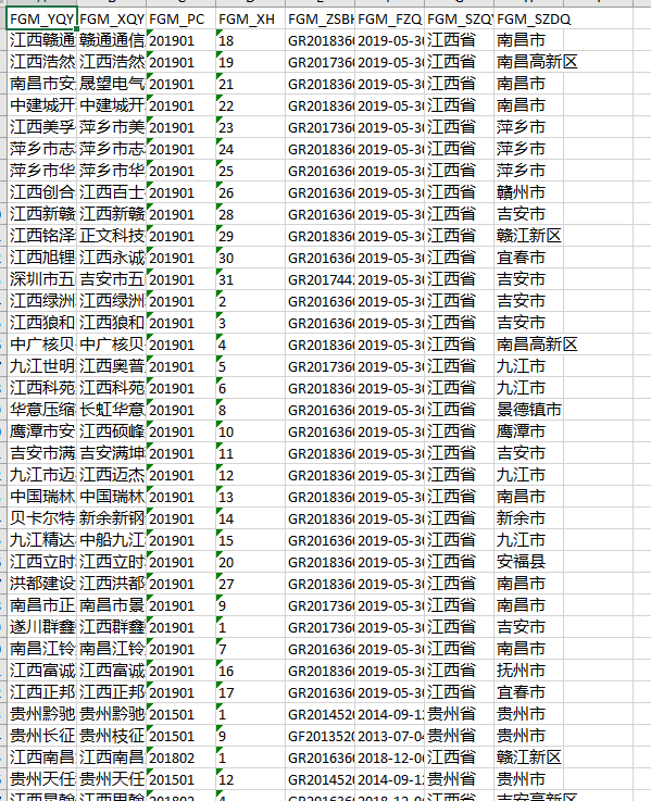 FGM_YQYMC原企业名称 FGM_XQYMC现企业名称 FGM_PC批次 FGM_XH序号 FGM_ZSBH证书编号 FGM_FZQ发证期 FGM_SZQY所在区域 FGM_SZDQ所在地区