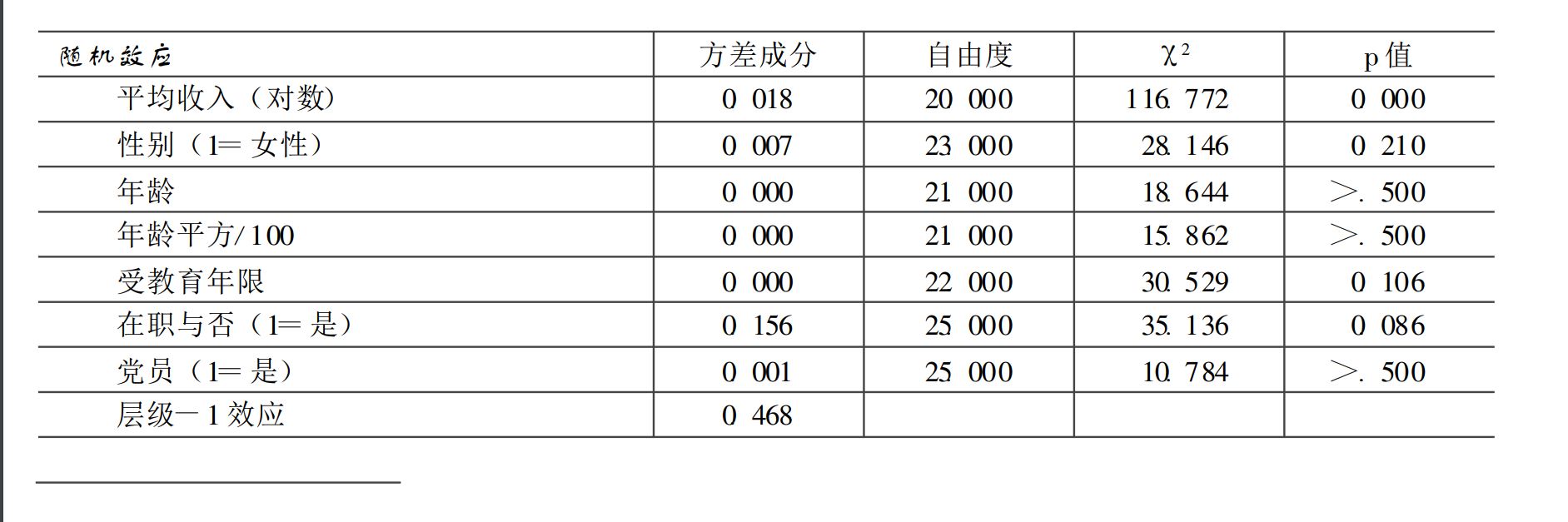 最近在学习多层线性模型,发现写作时,在汇报统计量上时,一般会汇报随机效应部分的自由度、卡方与p值,如图所示。但是,我在用stata学习操作时,一直不知道如何调出命令来计算随机效应部分的自由度、卡方与p值,望大神赐教,非常感谢!