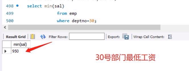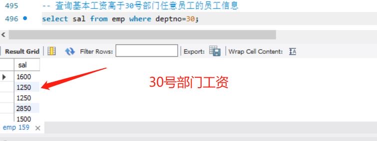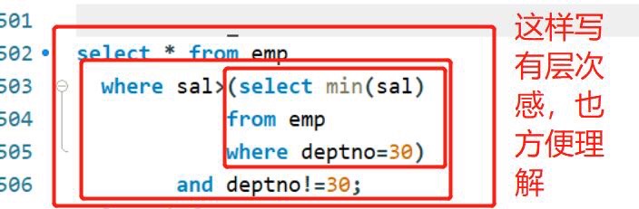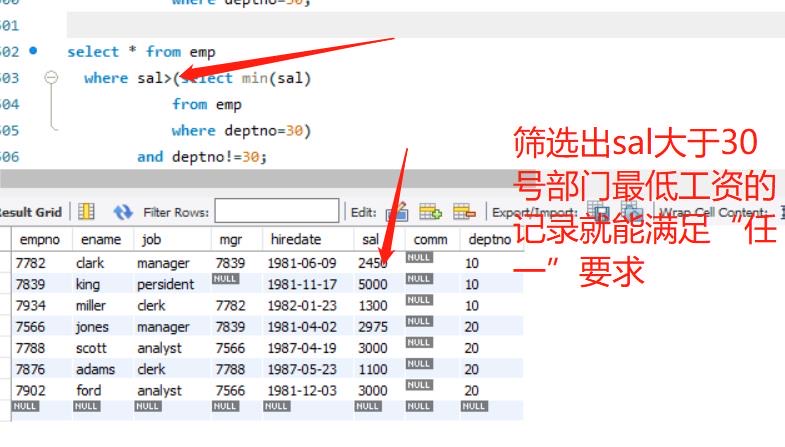 今天重头戏就是子查询,在这里分享下对于他的理解,遇到子查询时,先去分解,从最里层开始,以下题为例,要求基本工资高于30号部门任意员工信息.首先要知道30号部门员工工资是多少?通过第一副图查询得到,其次,怎么去理解“任意”,就是只要有大于30号部门工资的都可以,那么只要工资大于30号你们工资最低的就可以,通过第二幅图实现.最后,综合写句子的时候,从下往上写.有个小小心得就是,写sql语句时建议像我这样写,有层次感,也便于我们自己理解.