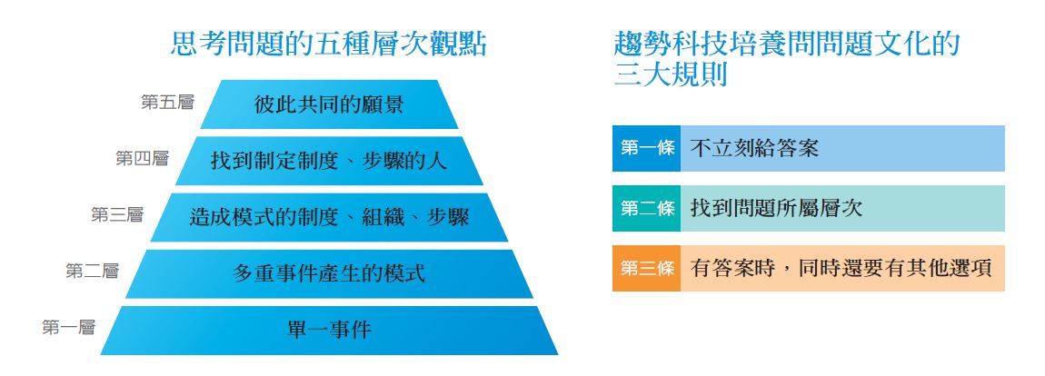 讓員工知道官大不是學問大,趨勢科技有三項規則。規則一是不要立刻給答案。規則二是找到問題所屬層次,先不談解答是什麼,面對這個問題,先問層次夠不夠高,要一直問下去,找到真正的問題。