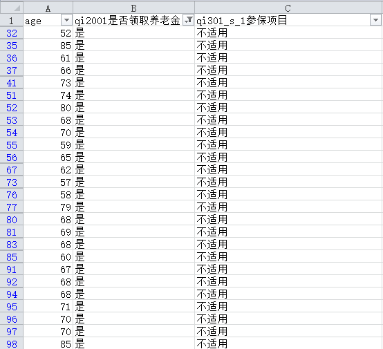 为什么CFPS2018中“是否领取养老金”选择“是”,“参保项目”就全部都是“不适用”啊?那岂不是一个有用的数据都获取不到了?如下图所示: