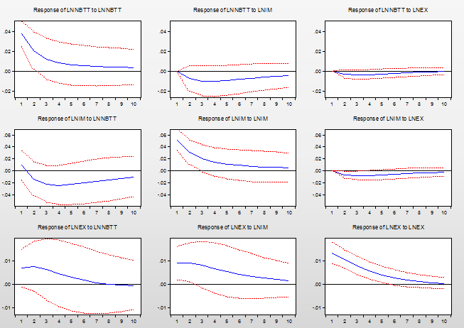 做出来一个关于产品出口额比重、进口额比重 和贸易条件的脉冲响应分析图 但是看不懂 不知道该怎么解释这个图形?
