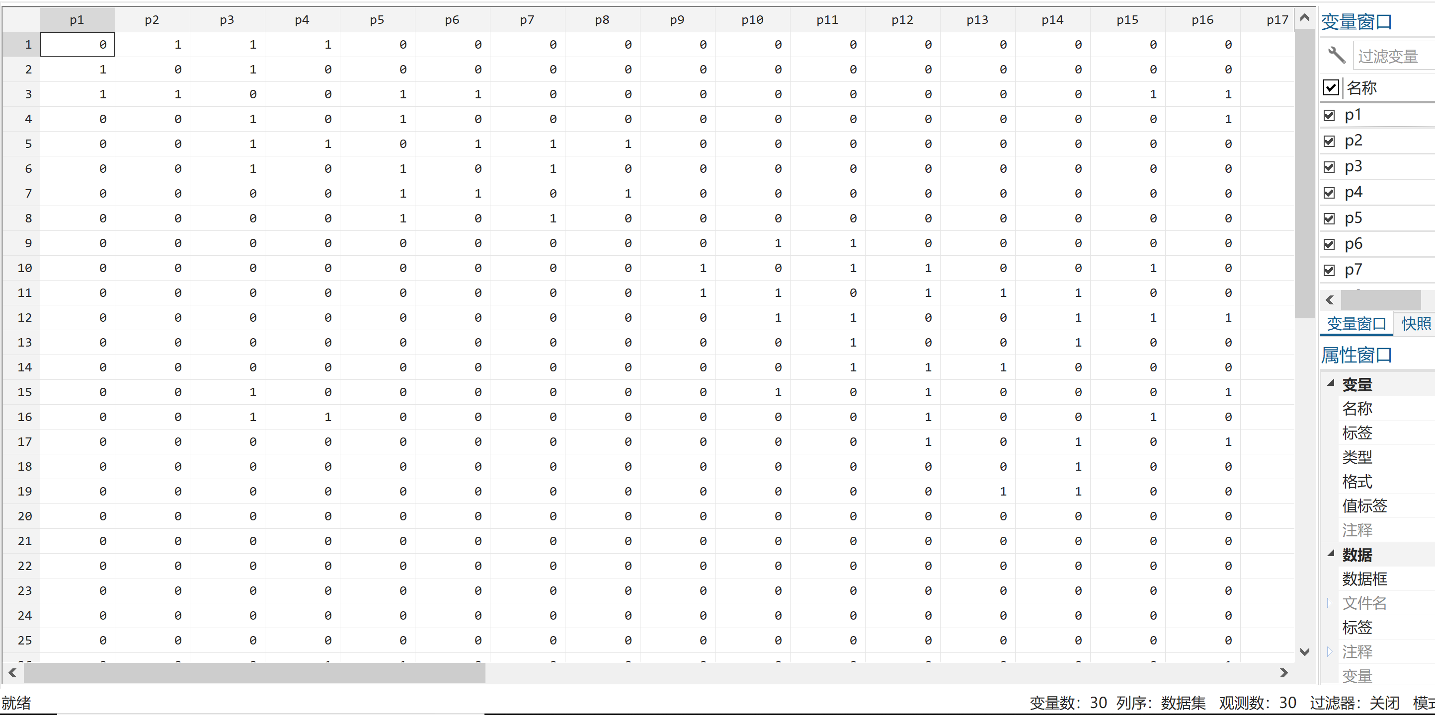 这里以30个省份的邻接矩阵为例,p1-p30代表30个省份,省份相邻赋值1,否则为0,该矩阵是未标准化的(注意:在进行面板数据的回归时必须用标准化的矩阵否则会报错!)保存至该路径下:C:\Users\Desktop\权重矩阵.dta
