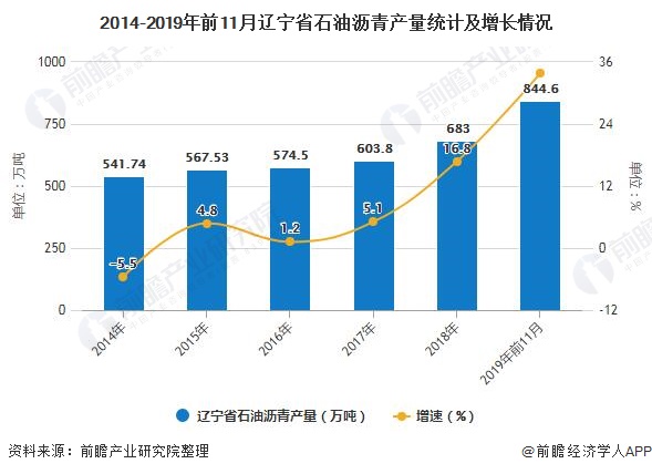 辽宁省凭借其相对充足的石油资源,在我国石油沥青生产领域具有较大优势,石油沥青年产量仅次于山东,排名全国第二位。据国家统计局统计数据显示,2014年以来,辽宁省石油沥青产量稳步提升,2018年,全省石油沥青产量为683万吨,同比增长16.8%。截至2019年11月,辽宁省石油沥青累计产量为844.6万吨,同比增长33.9%。
