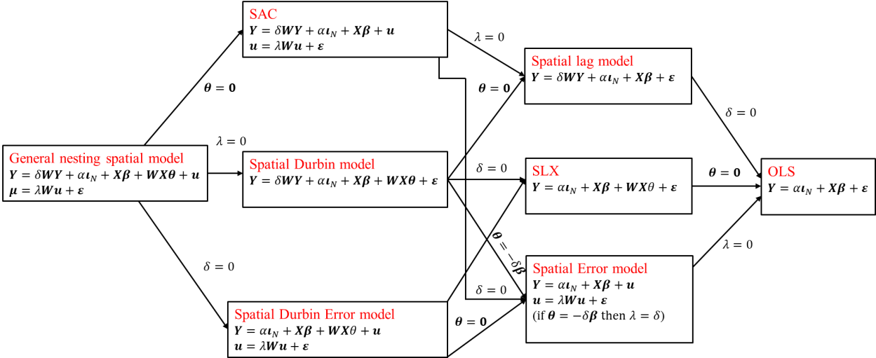 基于上述三种空间效应的组合,可以得到7种不同形式的空间回归模型。这些模型中,用得比较多的是空间滞后模型(SLM)、空间误差模型(SEM)和空间杜宾模型(SDM)。