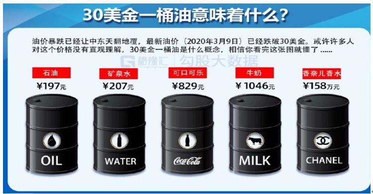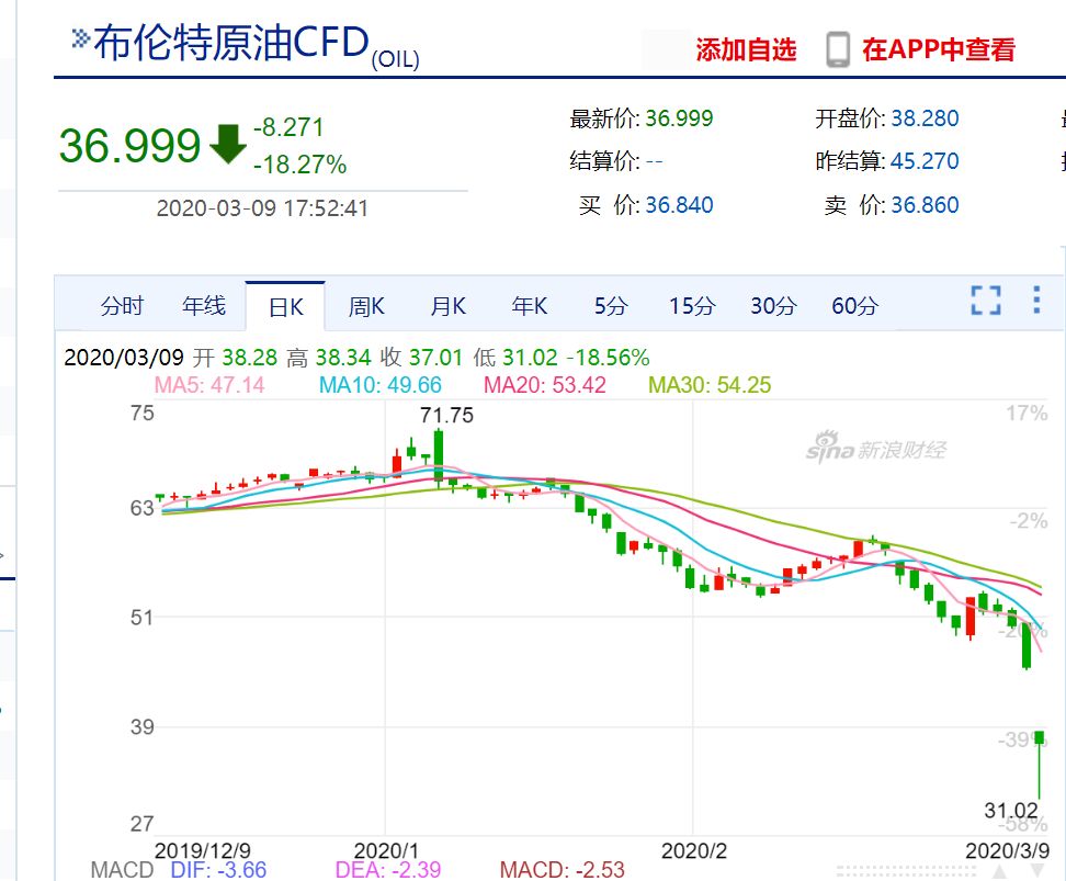 刚刚,布伦特原油今天开盘就跳空暴跌,最高下跌30%,最低跌到了30美元左右一桶!