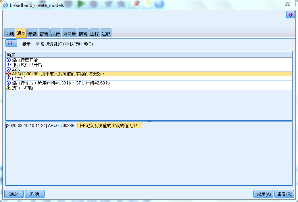 spss modeler18软件 用例程运行,一直提示用于定义观测值的字段的值无效,这是怎么回事啊??求助大神解答一下啊