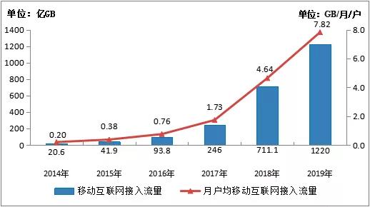 2019年,国内移动互联网接入流量消费达1220亿GB,比上年增长71.6%;全年移动互联网月户均流量(DOU)达7.82GB/户/月,是上年的1.69倍。