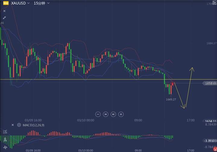 如图,金价在15分钟级别,反弹的压力其实就是顶底转换,主要集中在1660附近,这是之前多次试探的底部位置,而下方无疑就是1642的支撑,目前关注的重点在1660,这也是日线布林线中轨的位置,而4小时MACD出现了死叉向下,短线还有继续向下的空间,可以先考虑空,待1642附近再视情况做多。