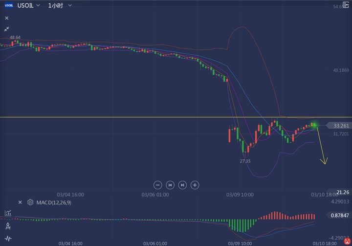如图,原油方面跳空30%之后,以27为支撑点上涨,到达33.40的位置,其实这个点在昨天文中已经讲过,以此为压力点继续回落,如果这个位置破位,就会向上回到41附近的缺口,油价大幅的下跌主要是受沙特方面价格战的影响,短线可能会继续释放,但未来从长远来看,美国绝不允许这样的事情发生,一定会出手干涉。