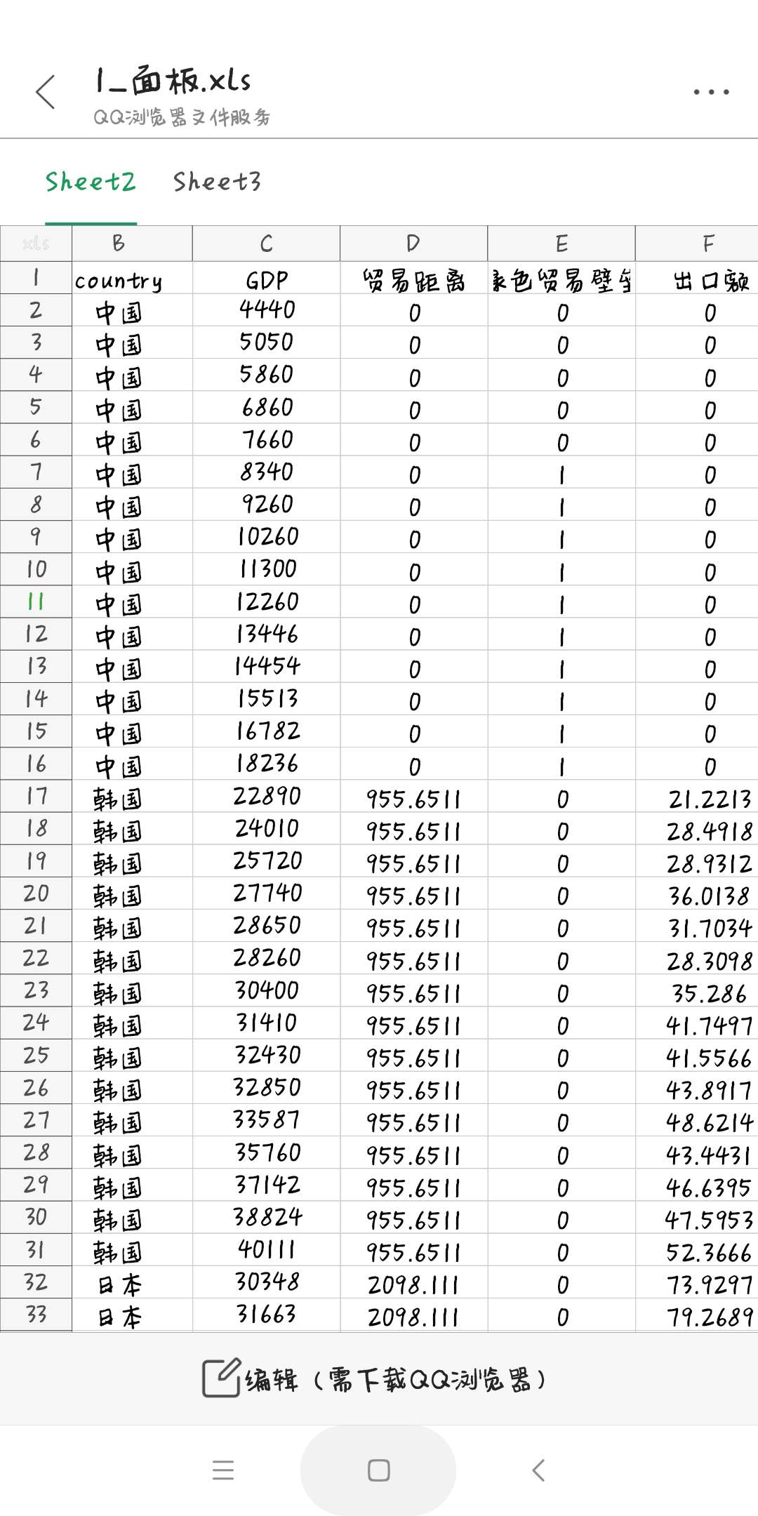 1904356431 发表于 2020-3-10 15:34 引力模型已经进行变化后取对数,现在发现数据类型不一样,好像不能进行回归<br> 中国和进口国2004-2018 ...